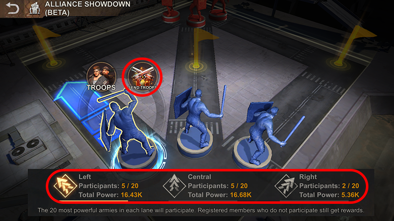 In each round, two alliances compete against each other on three lanes. Each player can only register on one lane. Any number of players can register on each lane, but only the 20 strongest players of a lane will participate in the fight.