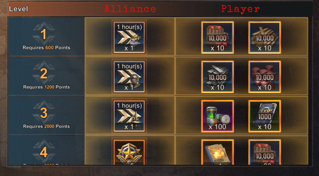 The number of rewards depends on the points of the alliance. The more points all alliance members have made, the higher the reward level. The number of levels depends on the tier of the alliance. The level reached by the alliance, also unlocks the rewards for each player. In order for the player to redeem them, he must reach the corresponding personal score.