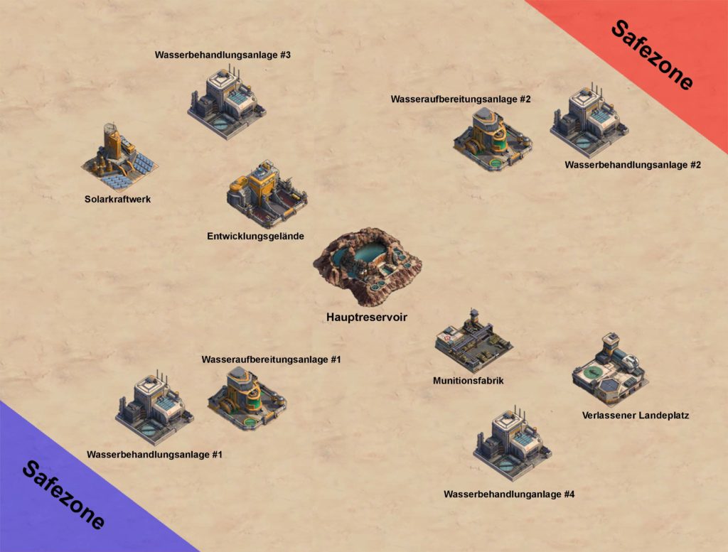 Von der “Safezone” aus kann man Gebäude besetzen und Siedlungen angreifen aber nicht angegriffen werden. Wird die Siedlungsbarrikade zerstört, landet man automatisch in der “Safezone”.